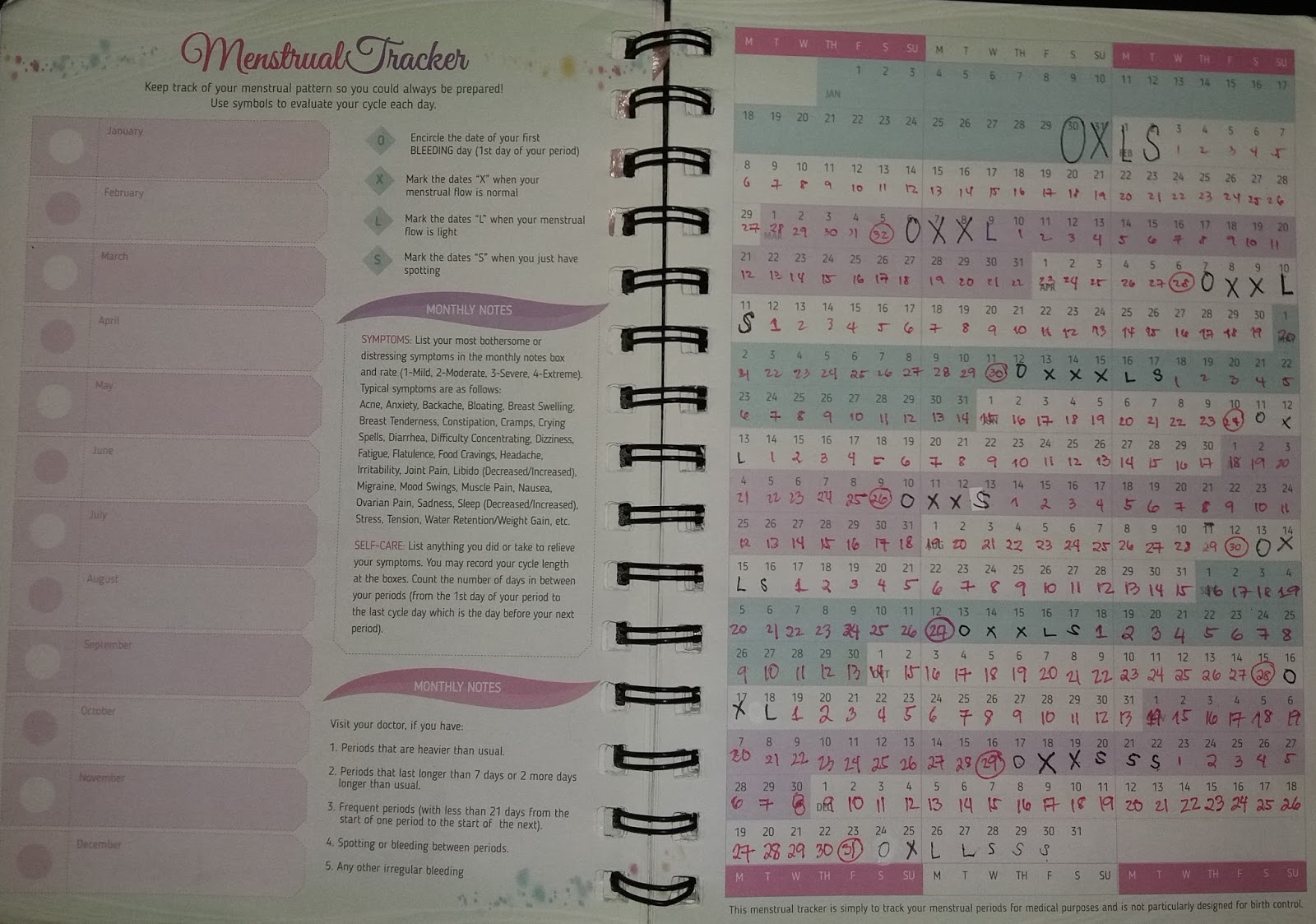The planner is designed generally for girls. This is evident on the color themes and art included in the planner. Thus, it’s really useful that it includes a menstrual tracker where you could track when you had your period. It even has a system for recording which days you had normal flows, heavy flows, and spotting. This is extremely useful when it comes to preparing ahead and for future medical concerns that may arise. If there would be any problems that would occur where the doctor would need data on the frequency of your menstrual cycle, this would come handy.