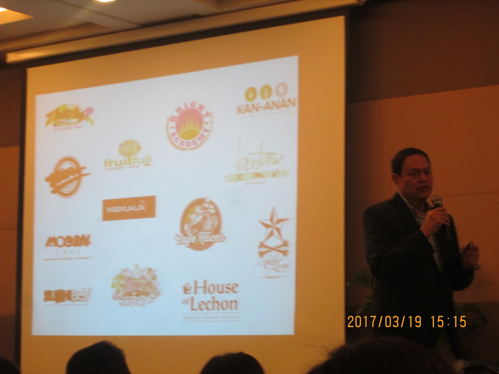 | Engr. Pages during his talk. The institutions and brands he owns are flash on the screen. |