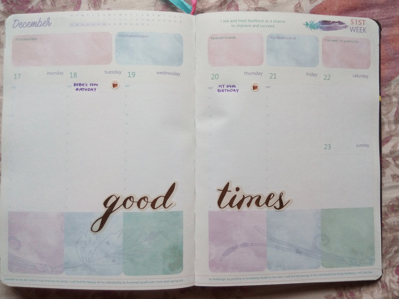 Let’s start with the basics. This is actually the first time that I had my planner personalized. You could do that by ordering through their website, ilovebdj.com. The personalization is free, and the planner costs Php580, plus the shipping fee, which varies from place to place. I chose the Smyth-sewn one just like my 2017 planner because it still is in great shape today after almost a year.